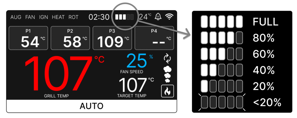 - Each of the 5 bars on the pellet gauge represents 1.2 kg of pellets, or around 5 hours of operation when set to 100℃ / 212℉ on a 20℃ day.