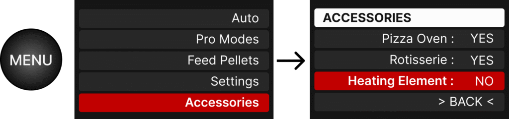 Before running the grill off a battery pack that may not have enough power to run the heating element, turn it OFF by setting to NO in the Accessories menu.